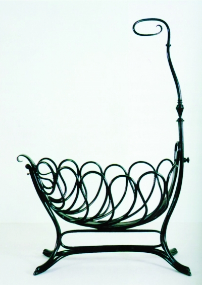 把这个精心制作的弯曲木摇篮铺上厚厚的垫子,你就会看到一个柔软温暖的蛋壳形婴儿睡床。这是一个线条柔顺、充满了舒适感的设计。它优雅的姿态、弯曲的造型和立在一侧用于悬挂帐子的修长的帐杆都反映出当时非常流行的“新艺术”风格。在全欧洲入时的家庭中,这样的摇篮随处可见。