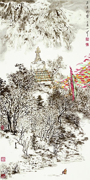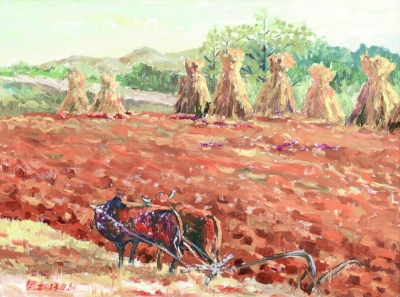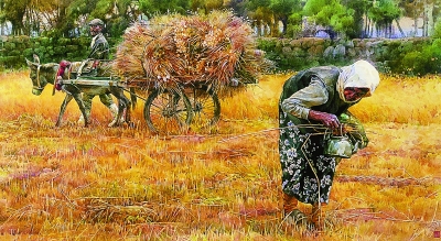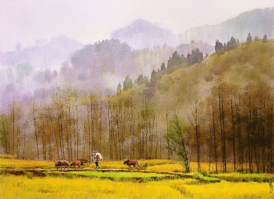 在二十四节气申遗成功之际,回望艺术家们笔下的季节之美,让我们对生命和自然有了更深的体悟。节气独有的情绪都在不同的色阶之中得到了诠释。春的主题创作凝聚了艺术家对生命力量的赞颂,水彩作品《沈陵之春》笔法轻盈、简洁明快,将艺术与生活有机地结合在一起,草木间无不饱含万物复苏带来的喜悦之情;艺术家对夏天的情感是多样而复杂的,既有水墨写意作品《彩荷》的清凉剔透,也有《暑至临溪濯足》的悠然恬静;秋景的描绘寄托了画家对大地的感恩和眷恋,《秋原》《拾穗者》等作品以物候、民俗、农事等为对象,表现出各个节气的变化,反映了几千年来中华文化生生不息传承下来的智慧、文化与思想,兼具科学性和趣味性;冬的大雪埋没了尘土也过滤了喧嚣,大面积的雪景描绘和细腻的笔触是许多艺术家表现冬景的手段,作品《冬至》构图精妙、造型精整、线色明捷,以严谨的人物造型和笔墨形成唯美典雅的作品风格,意蕴隽永。