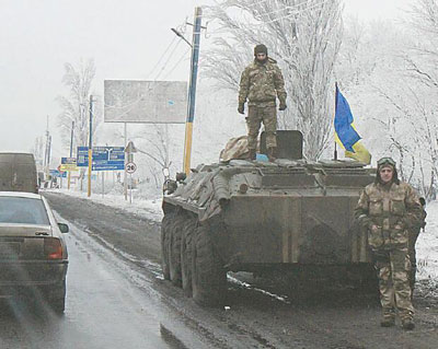 这是12月24日在通往乌克兰顿涅茨克市的路上拍摄的从前线撤回的乌政府军装甲车。乌克兰东部顿巴斯地区(泛指乌东部顿涅茨克州和卢甘斯克州)24日实现停火,冲突区域“接触线”附近的军民生活呈现出过节气氛。