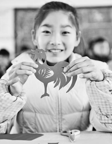 12月29日,山东枣庄台儿庄区张山子镇中心小学五年级学生在剪纸课上,剪出大公鸡、福字等图样,迎接2017年的到来。