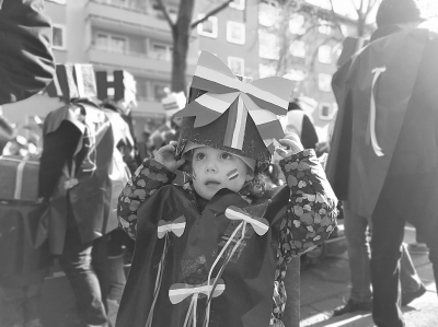 美因茨狂欢节是与科隆、杜塞尔多夫齐名的德国三大狂欢节之一。从前一年的11月起,狂欢季持续到新一年的二月底,其中“星期六的少年面具游行”是狂欢节的高潮部分之一,这一天由学校或社团、家庭组织儿童和青少年走上街头,穿着色彩鲜艳的不同主题服装,展现孩子们的想象力和传统民俗。图为打扮成“礼物”造型的当地少儿。