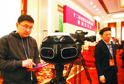 手机直播、全景相机等采编手段和装备成为众多媒体记者报道两会的新武器。本报记者 郭俊锋摄/光明图片