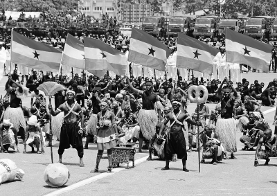3月6日,在加纳首都阿克拉独立广场,身着加纳民族服装的民众在庆祝活动上表演传统舞蹈。当日,加纳在首都阿克拉独立广场举行游行及阅兵式,庆祝独立60周年。 新华社记者 石松摄