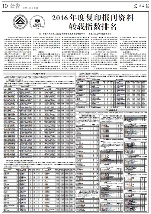 2016年度复印报刊资料转载指数排名