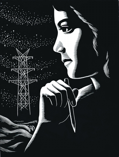 女青年手执描笔,专注而自信,背景是夜空广宇点点繁星和波澜壮阔大海衬映而出的象征科技建设的高压电架。细密的排线反衬出人物形象,画面纯净透亮,技巧细腻微妙,作品富于象征意味并充盈着诗性的气质,新时代广阔社会背景之下,一位年轻人的朝气和理想诗情,也跃然纸上。