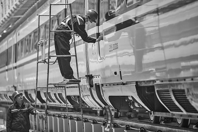 日前,陕西省西安动车段检修库内,技术人员加班加点,对即将在4月1日西贵(西安至贵阳)线上正式运营的动车组列车进行全面体检。4月中旬,全国铁路将实施新的列车运行图,新图实施后,西安铁路局开行客车总数将达到284.5对。西安动车段根据新增车次,提前完善各项检修标准,为开行做好车体保障。王曙天摄/光明图片