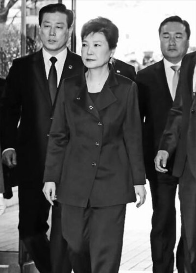 3月30日,在韩国首尔,朴槿惠(中)走进首尔中央地方法院。韩国前总统朴槿惠3月30日上午出庭接受法院审问,成为韩国1997年实施逮捕令签发前审问制以来,首名受到审问的前国家元首。