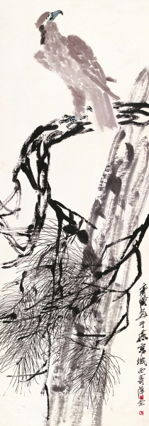 常与松搭配的美术形象还有鹰。试看齐白石的《松鹰图》,画中苍鹰目光辽远、毛羽飒然,在劲爽的松枝上蓄势待发,令人顿生“何当击凡鸟,毛血洒平芜”的豪情。