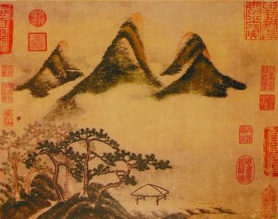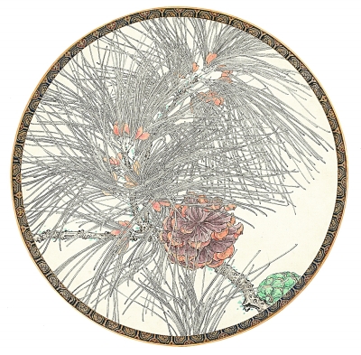 据南朝梁任昉《述异记》记载:“汉惠帝七年夏,雷震南山,林木皆自火,燃至根,其地悉皆燋黄,后其雨迅过,人就其间得龙骨一具。”可见,在古人眼中,松树之所以呈盘曲之状,是因为有龙藏于其中,而中国民间自古就有“敬龙祈雨”的传统,因此,作为龙的栖居之所,松也自然成了人们敬仰的对象,寄托着农业社会里百姓渴望雨水丰沛的朴素愿望。在唐代寺院的壁画里,除了涅槃图、菩萨像等各类经变图之外,最常出现的就是龙和松,壁画上还常配有祈雨诗文,如“不求千涧水,止求两株松”等。而据史家考证,在唐代,越是旱年,寺庙中以松为主题的壁画就越多,足见松在中国美术实践中的分量愈加厚重,逐渐演化成为象征着风调雨顺、国泰民安的文化符号。