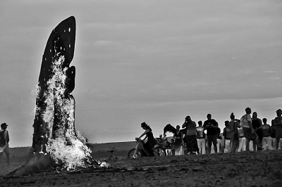 4月29日,在南非北开普省的卡鲁沙漠,人们观看一件焚烧的艺术品。2017年“非洲火人节”4月30日在南非北开普省的卡鲁沙漠收官,来自全球上万名艺术家建造的沙漠“海市蜃楼”在大火中化为灰烬。今年的“非洲火人节”4月24日开幕,在短短的几天时间里,各国艺术家自带生活用品,在沙漠中建造了一个名为坦克瓦的小镇。这里有教堂、高塔、雕塑、动物造型以及各种抽象的艺术作品,如同超现实的海市蜃楼。人们在这里创立各种主题的营地和社区,举办各类音乐会和文艺表演。 新华社发