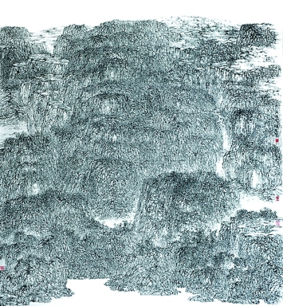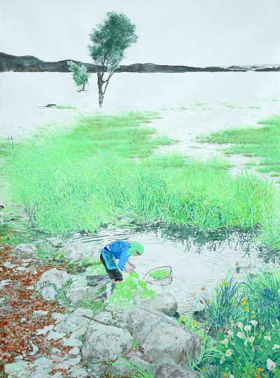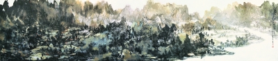 “我喜欢时代主题鲜明的作品,因为重庆为我们留下的历史记忆和精神财富太多太多。”对于画家张春新来说,重庆的色调应该是厚重而沉着的,无论是作品《大山深处》里的父老乡亲,还是少数民族系列里的人物绘画,张春新笔下的人物造型似乎都带有一种雕刻感,面部的棱角肌理,衣褶的顿挫转折都映射出画家对于历史记忆的追念和感动。而对于来自农村的年轻画家唐德福来说,重庆的色调却是温暖又湿润的泥土色。毕业于四川美术学院的他深受“乡土艺术”的影响,但相比沉重、严肃的历史题材,唐德福更乐于在朴素的日常生活中寻求真我。“儿时在农村的生活片段、外婆生日举办的坝坝宴、和玩伴的田间游戏都是我创作的重要元素。”驻足自己的作品《洱畔》前,唐德福讲述着自己对于“乡土艺术”的理解,画面中纵横交错的植被和烦琐的细节都需要投入大量的心血来刻画,而每每落笔,都是他对重庆色调的定义。可能在大多数人心中,“重庆”并不是温婉的代名词,她应该是火辣、积极而有力的,那么画家陈起可以说是很“重庆”。陈起眼中的重庆应该和他的画作一样,黑白分明、对比强烈、苍劲有力,从《大山不语》到《武陵清寂》再到《云憩武陵》,在相同题材的反复创作间,画家不断寻求着自我的风格形成和笔法突破。中国水墨画是黑与白的艺术,墨色画的不单是阴影体面,更是结构与黑白构成平衡的美感,其求索之路着实不易,如陈起所说:“画画是艰辛而幸福的,前有古人,后有来者,只有谦虚学习并真正深入生活,才能把自然转化为图式,把感悟凝练为笔墨。”