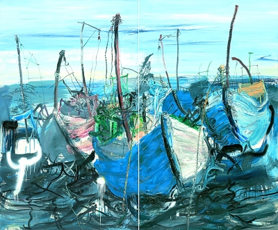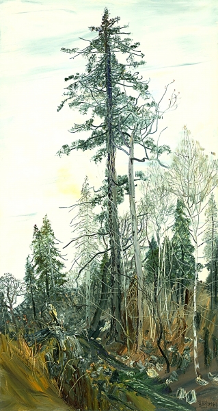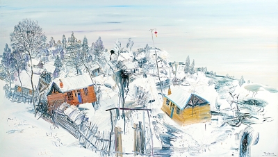 赵开坤的绘画受长白山的滋养尤深。长白老林的高树将他的笔磨炼得风姿信然。那长杆挺拔,向空中的高处攀缘;尽梢处,细枝婆娑。油画的用笔囿于料材的迟滞,难以如水墨般自由挥洒。但开坤的笔却不尽自由,挥洒横出,既见树形,又现风神。那空中常有流云,在其极白处,枝丫惊蛇般穿梭。枝丫之下,浓重的松影却似波涛,在长林中抚掠,似有雷声滚过。他的柳树梨花却又是另一番景象,那柳一缕一叶都乘着风,接地处,往往有一条长路或一围篱墙向纵深延展,更显惠风之象。一杆笔该硬处如钢,该柔时若风,如此天地万物一例相看,却又风姿信然,心亦吐纳,是开坤绘画最令众人羡羡然之处。