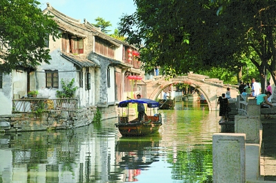 “大家看,这就是著名的钥匙桥‘双桥’。”随着导游的指引,游客们纷纷抢好位置与双桥合影。1983年,旅美画家陈逸飞把创作的周庄“双桥”油画取名为《故乡的回忆》。藏在深闺人未识的周庄走出了国门,走向了世界。建筑大师贝聿铭称:“周庄是国宝。”