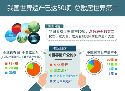 截至目前,我国共有世界遗产50项,其中自然遗产11项、文化与自然双遗产4项、文化景观遗产5项、文化遗产30项。中国的世界遗产总数位居世界第二位,仅次于意大利的51项,是名副其实的世界遗产大国。在北京大学世界遗产研究中心主任谢凝高看来,这些世界遗产集中展示了科学、美丽、文明的中国形象,成就辉煌,影响巨大。