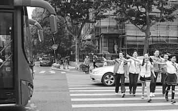 杭州小学生为礼让斑马线的司机点赞。吕若禾摄/光明图片