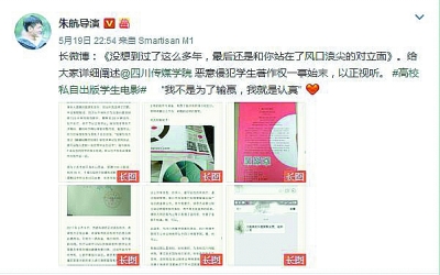 近日,90后青年导演朱航与母校四川传媒学院因《翩翩起舞的姑娘》的版权纠纷事件引起社会广泛关注。版权纠纷源于朱航于2014年毕业时所提交的一件毕业作品,未经其许可被学校擅自集结刻录成DVD光盘在校内外传播且标价销售。朱航得知这一情况后,与校方沟通无果,最终选择了通过微博进行公开维权。