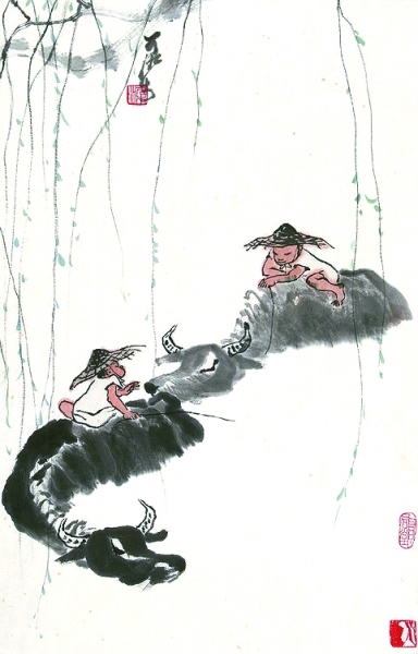李可染把自己的画室叫“师牛堂”,他说:牛也,力大无穷,俯首孺子而不逞强,事人而安不居功……中国人对牛有一种特殊感情。鲁迅说:横眉冷对千夫指,俯首甘为孺子牛。毛泽东的文章里又极认真地引用了鲁迅的话。郭沫若称牛为“国兽”,他说牛:活也牺牲,死也牺牲,死活为人民。