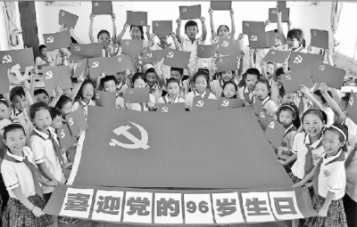 6月26日,湖北省十堰市郧阳区柳陂镇中心小学举办“党在我心中”主题活动,孩子们通过手工制作党徽、党旗、上党史课等形式,迎接党的96岁生日。杨显有摄/光明图片