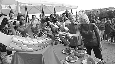 多瑙河畔日前举办了一场别开生面的龙舟友谊赛。奥地利国民议院议长布勒斯、联邦政府艺术和新闻部长多罗茨达、国民议院社民党议会党团主席希德尔、维也纳多瑙区区长等十多位政府官员和议员组队同中国驻奥地利使馆举行龙舟比赛。图为李晓驷大使(前排右二)陪同奥地利国民议院议长布勒斯女士(前排右一)开赛前为龙舟点睛。本报驻维也纳记者 王怀成 摄/光明图片