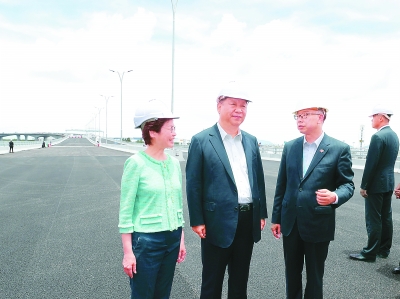 习近平首先来到港珠澳大桥香港段建设工地,听取建设情况介绍,仔细询问工程规划、施工进度和质量安全等情况。得知香港特区政府负责建设的香港接线已全线贯通,正在进行地面道路建设、路面沥青铺装等工程,习近平对所有工程建设者表示感谢。他指出,建设港珠澳大桥是中央支持香港、澳门和珠三角区域更好发展的一项重大举措,是“一国两制”下粤港澳密切合作的重大成果。希望大家积极推进后续工作,确保大桥顺利通车、安全运行。