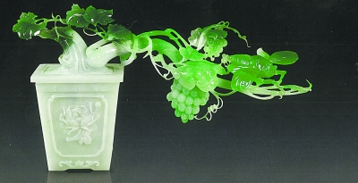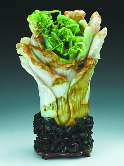在中国的玉雕技法中,还有一项独具特色,即为“俏色”。有些玉料中经常带有一些杂色,弃之可惜,匠人们便以杂色部分的形与色为基础进行设计。清代玉雕《翡翠蝈蝈白菜》即采用了此类技法进行雕琢。白菜根部基本呈白色,而白菜的顶部及蝈蝈的形态运用玉的黄、绿之色进行表现,塑造出了白菜被霜冻之后的质感以及绿蝈蝈在食用白菜时的场面,极富自然妙趣。中国古人历经数千年不断钻研、创新玉石雕刻技艺,时至今日,这些技法的综合运用,更能烘托出玉石之美。