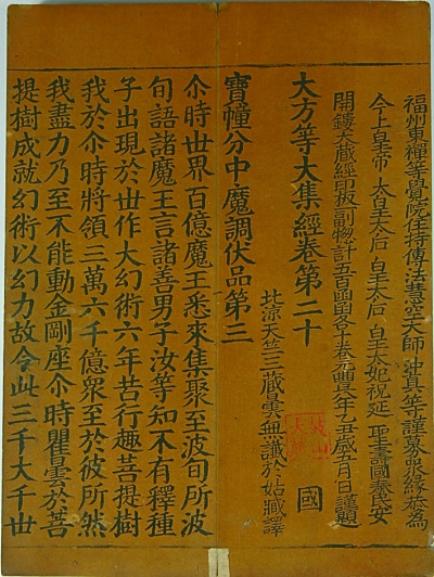 太原市文物考古研究所保存的《崇宁藏》为原太原市文物商店于20世纪60年代征集所得,后此批古籍入藏原太原市文物管理委员会。1998年后,因机构变动,太原市文物管理委员会原藏所有文物包括此批古籍由太原市文物考古研究所保管。第一次全国可移动文物普查开展后,在清库过程中,普查队员在专家指导下,对这批古籍进行了著录登记。这批《崇宁藏》为零本,共12本,均有不同程度残损,其中的6本因缺少卷首和卷尾,普查队员以“残经”命名。现经核对残存经文,可以确认各卷卷名。