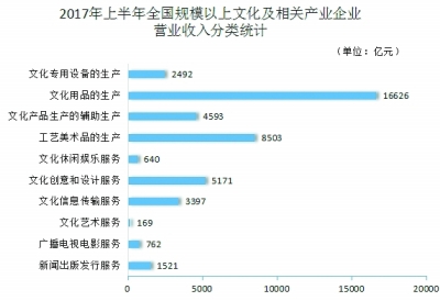 数据显示,文化及相关产业10个行业中,有6个行业今年上半年实现两位数增长,包括:以“互联网+”为主要形式的文化信息传输服务业营业收入为3397亿元、同比增长32.7%;文化休闲娱乐服务业收入640亿元、增长16.8%;文化艺术服务业收入169亿元、增长14.7%;文化用品的生产收入16626亿元、增长13.2%;工艺美术品的生产、文化产品生产的辅助生产收入分别为8503亿元、4593亿元,均增长10.5%。而去年全年,只有三个行业保持两位数增长。