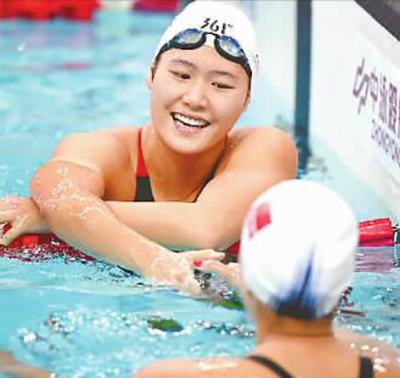 天津奥体中心游泳馆同样高潮迭起。伦敦奥运会后,沉寂了五年的浙江选手叶诗文,最终再一次爆发:在女子200米混合泳决赛中,赛前并不被人看好的她却带给观众一个大大的惊喜,以2分10秒91的成绩第一个触壁。这个成绩虽然和她奥运会夺冠的成绩比还有不少差距,但却已属国内近几年的佳绩。