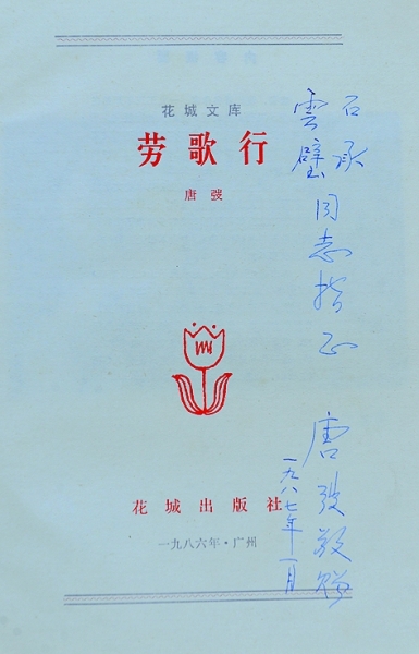 陈子善在《签名本丛考》中提及的25位作家中,有3位作家的签名本我也收藏,虽不及陈先生所谈之珍稀,但也值得在此略作介绍。其一是唐弢的旧体诗词集《劳歌行》,系其签赠给扬州大学中文系章石承教授的著作。我爱读唐弢的书话文章,原本是想搜购一册《晦庵书话》的签赠本来作为纪念,但在网上看到此签赠本,真可谓大喜过望。此书的著者唐弢终生研究鲁迅,又是新文学研究的开拓者之一;而这位受赠者章石承则以研究古典文学为业,且师承于诗词大家龙榆生。虽然唐弢与章石承身在不同领域,又处于不同城市,但他们分别是当代著名学者汪晖的博士与硕士研究生导师,后者曾分别作文记之,故此签名本作为一种见证,也是很有意思的。其二是陈从周的《帘青集》,此书系“敬献给同济大学校庆八十周年”而出版的一册散文集,书前衬页有陈从周的签名,扉页又有其用钢笔所写“校庆留念 八七.五.十七 从周”字样,可见陈先生对于此事的重视。其三则是陈白尘的《云梦断忆》,此系陈白尘的干校回忆集,收录在三联书店的“纪实文丛”之中,乃是签赠给导演“逸生淑芝”夫妇的,联想陈子善收藏的那本《升官图》,系其签赠给导演陈鲤庭,由此可见作为剧作家的陈白尘的交际和他所看重的人。