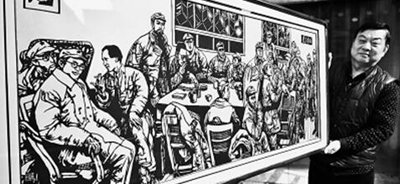 在遵义会议召开八十三周年之际,贵州省遵义市民间剪纸艺人刘志华精心创作剪纸作品《遵义会议》《遵义会议会址》和《苟坝会议》等红军长征在遵义系列作品,传承红色文化,弘扬长征精神。图为1月14日,刘志华在展示剪纸作品《遵义会议》。罗星汉摄/光明图片