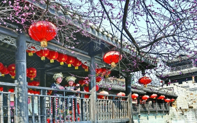 1月22日,湖南省湘西土家族苗族自治州吉首市乾州古城三门开梅廊的蜡梅凌寒开放,苗家姑娘兴致勃勃地观赏梅花。
