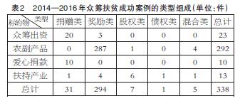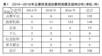 从数量规模分布来看(如表1所示),2014年1月1 日至2016 年12月31日3年间,我国主流媒体报道的众筹扶贫事件累计达338件。其中2014年18件,2015年39件,2016年281件,分别占总数的5%、12%、83%。