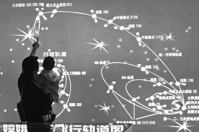 4月22日,位于山东烟台的山东航天电子技术研究所举行开放日活动。不少市民来到航天科技展厅,近距离观看各种航天装备模型和空间技术图示,学习航天和太空知识,了解我国航天发展成就,迎接4月24日“中国航天日”的到来。图为市民在航天科技展厅观看“嫦娥卫星飞行轨道图”。