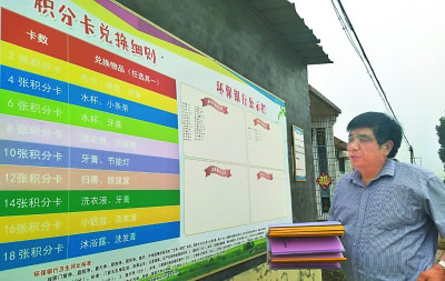 先找载体:各村寻找交通便利、物品齐全的超市,挂牌成立“环保银行”。再出台评比细则:做到门前净、庭院净、室内净、厨房净、厕所净、室内外物品摆放符合规范,最高可得15分。得1分,可到环保银行兑换0.1至0.2元,也可以一直在“环保存折”中累计,兑换等值的日常生活用品。如果是贫困户家庭,连续三次被评为“优秀卫生家庭”,还可以“贷款”,用信用度透支50分以内的现金或日常生活用品。