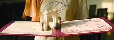 为了保证录取通知书中信息的完整度,留给立体二校门的空间只有内页中间不到十厘米的空隙。在纸模的摆放位置上,我们尝试了多种方案才实现了视觉平衡:选取内页中部偏左的位置斜放二校门,可直观地感受到它的结构与层次;在二校门上多加一个固定点,保证打开录取通知书时不会太过松散。