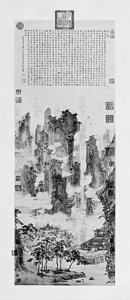 至此,传世《仙山楼阁图》《云溪仙馆图》与失传《仙山图》上题写的《仙山赋》的作者问题、相关古书如《式古堂书画汇考》和《江村销夏录》中的讹谬问题,便昭然若揭了。由此可见,作为中国画传统的画题跋,隐藏着大量的有用信息,对研究和判断画作作意、作者交游、甄别真伪等,皆大有裨益。一幅画作往往碍于其创作的瞬时性,无法详言其来龙去脉,但题跋文字得天独厚的历时性与累积性,却能发挥彰往察来、微显阐幽的荣光,这就是它的文献学价值。