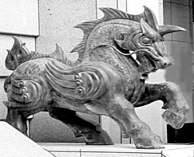 在一些法院、检察院或者大学法学院的门口,我们经常会看到一种造型怪异的动物塑像,体形大的像牛,小的像羊,全身长着浓密的青毛,体态刚健,类似麒麟,瞪着两个大眼睛,很威严,最奇特是它的脑袋上还长着一只尖尖的犄角,俗称独角兽。这就是獬豸。