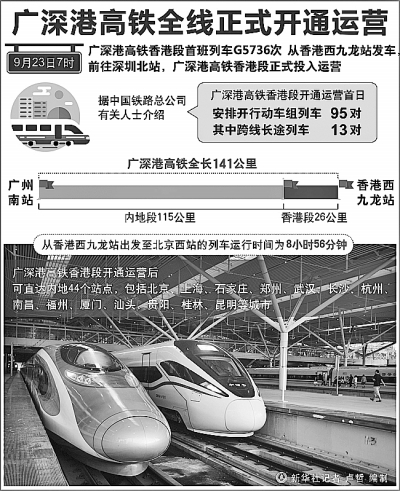 9月23日,广深港高铁香港段正式开通运营,首次将香港连入祖国高铁网,标志着广深港高铁全线贯通。这条高铁的全线贯通,将大大缩短祖国内地与香港特区的时空距离,增强祖国内地与香港特区的经济协作;强劲提振粤港地区经济融合发展,助推粤港澳大湾区经济繁荣发展。
