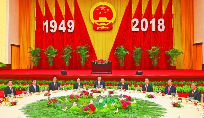 人民大会堂宴会厅华灯璀璨,鲜花绽放,洋溢着喜庆热烈的气氛。主席台上方高悬庄严的国徽,“1949-2018”的大字年号在鲜艳的红旗映衬下格外醒目。
