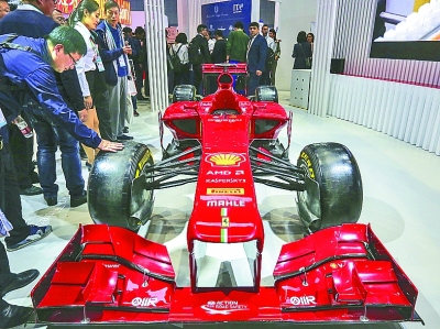 人们在意大利展区参观一级方程式赛车模型。新华社发