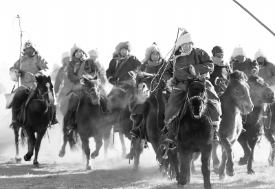 12月29日,内蒙古自治区锡林郭勒盟正蓝旗举行第十六届“浑善达克”冬季那达慕。图为牧民们骑马参加那达慕活动。