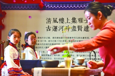日前,河北省沧州市在小学生中开展“礼仪润童心”活动,引导孩子们学习文明礼仪规范,养成知礼仪、讲文明的好习惯。图为学生向茶艺师学习传统茶艺。傅新春摄/光明图片