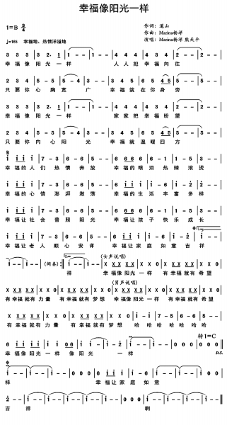 节奏明丽、旋律清新、歌词简单、演唱深情,《幸福像阳光一样》由杨洋作曲、道山作词,并由熊天平、杨洋这对乐坛贤伉俪共同演唱。