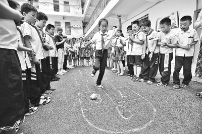 5月31日,河北省邯郸市滏河学校开展“老游戏、享快乐”迎“六一”主题活动,同学们玩着爸爸、妈妈儿时玩的游戏,感受童年的纯真与快乐,迎接“六一”国际儿童节的到来。图为同学们在玩“跳房子”游戏。郝群英摄/光明图片