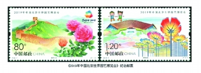 2019年4月29日至10月7日,世界园艺博览会在北京举行。开幕当天,中国邮政发行《2019年中国北京世界园艺博览会》纪念邮票,全套2枚。第一枚“绿色生活”,画面以在青山间蜿蜒的长城、北京市市花——月季,以及本次世园会的会徽——长城之花为主要元素,寓意园艺源于自然,倡导尊重自然、融入自然的理念;第二枚“美丽家园”,画面以本次世园会国际馆、中国馆以及吉祥物“小萌芽”“小萌花”为主要元素、整体画面生机盎然、朝气蓬勃,启示人们应当树立绿色、低碳、环保的生产生活理念,共同建设多姿多彩的美丽家园。