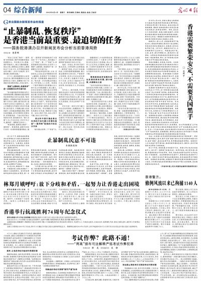 “止暴制乱、恢复秩序”是香港当前最重要、最迫切的任务