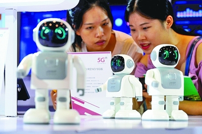9月7日,为期3天的首届中国-东盟人工智能峰会产品展在广西南宁国际会展中心拉开帷幕。来自中国移动、阿里云、华为、中科曙光等百余家企业现场展示的5G时代“衣、食、住、行、医”的最新智能技术与应用,让观众享受到了一场别开生面的科技盛宴。图为观众在中国联通5G体验区观看机器人跳舞。喻湘泉摄/光明图片