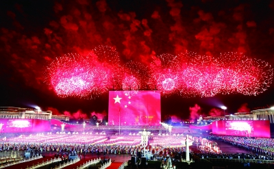 金秋时节的北京,张灯结彩,繁花似锦,处处洋溢着节日的喜庆气氛。从天安门广场到金水桥南端,大型“红飘带”主题景观、7棵特效光影“烟花树”、LED巨幅网幕、3000多名手持“光影屏”的联欢群众以及各族各界群众,将联欢活动核心区域装扮得流光溢彩、绚丽夺目。10个群众联欢区分布长安街沿线,数万群众以欢歌热舞,点赞共和国、讴歌新时代。