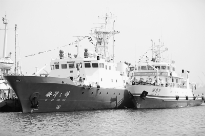 2019年6月,“科学三号”“创新二号”科考船在青岛西海岸新区母港准备启航。  新华社发