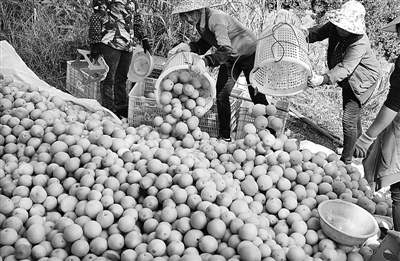 近日,江西省寻乌县的脐橙迎来采摘期,果园一派繁忙景象。图为11月6日,寻乌县晨光镇湖岽村的果农集中堆放刚采摘的脐橙。新华社记者 万象摄